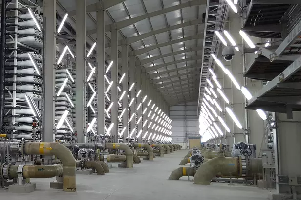 A large desalination plant with industrial structures and pipelines next to the ocean