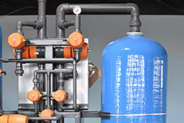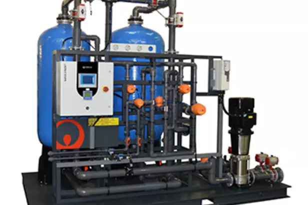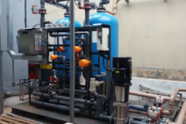 The system consists of two or three beds (glass-reinforced plastic pressure vessels) holding the ion exchange resins, together with a process pump, pipework, valves, flowmeters and controls. This enables the production of continuous high-quality deionized water and the automatic regeneration of the resins when required. The components are all mounted on a compact steel framework, coated for corrosion resistance.