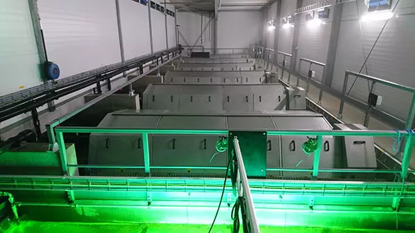 The water flow is treated first by drum filter to remove large particles. Then there is a moving bed bioreactor, which uses bacteria and other microorganisms to break down organic matter and remove nitrogenous compounds, such as ammonia and nitrite, from the water.