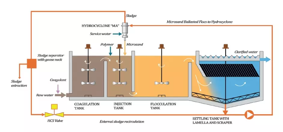 ACTIFLO® HCS’ principal feature is that it comes with a specific hydrocylone* and an external recirculation loop.