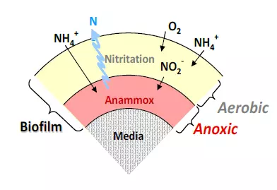 The two steps are taking place in a one-stage biofilm process in different layers of the biofilm: nitritation (aerobic) in the outer layer of the biofilm, anammox (anoxic) in the inner layer.