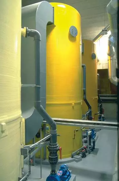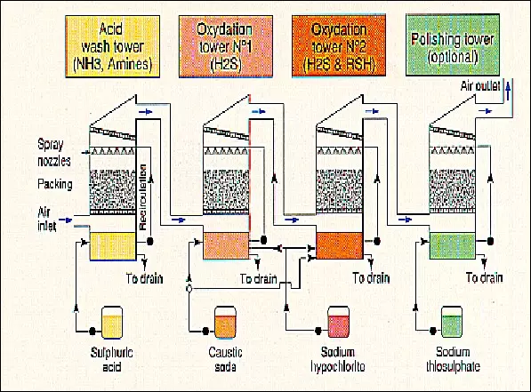 • The second and third, operated in basic conditions (pH 9 and pH 11), with the addition of an oxidant, are dedicated to the removal of sulfide compounds (H₂S, Mercaptans...). When the hydrogen sulfide content of the gaseous effluent is not too high, one tower of this type may be sufficient.