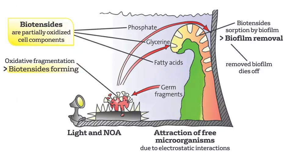 Using a specific wavelength range of light, oxygen species similar to those found in nature are formed directly on the surface of the full-metal catalysts. Thereby, undesirable side effects to people and the environment are eliminated. BerkeLYT GREEN performs completely without the use of biocides.
