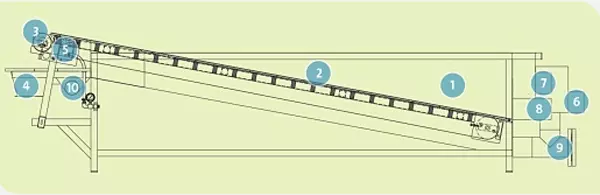 The belt is designed as a slowly moving conveyer installed in a stainless steel tank. As the water passes through the filter, the filtering process ensures the efficient removal of particles. These particles are drained on the belt to a high dry matter content. The dewatered sludge is removed at the top of the filter 3 and discharged through a hopper 4 for final treatment.