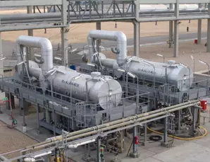 When no steam is available, it is still possible to use the MED process with a Mechanical Vapour Compressor (MED-MVC). In such case the vapour is recycled from the cold cell to the hot one by means of a centrifugal compressor driven by an electrical engine (refer to sketch). The electrical consumption of such system is in the range of 8 to 15 kWh/m3. Due to current limitation in compressors technology the maximum capacity of MED-MVC units is 5000 m3/day per unit.