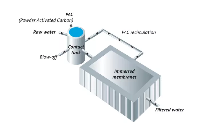 The activated carbon stage is combined with immersed membrane filtration. Pesticides and organic matter are adsorbed on the activated carbon.