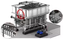 The DAF technology uses extremely small air bubbles to lift suspended solids and oil to the top surface. The formed sludge layer is scraped into a sludge holding tank. The addition of coagulation and flocculation chemicals may be required to enhance the performance.